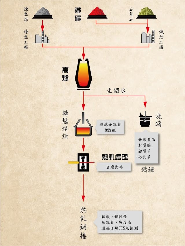 生鐵、熟鐵、鋼鐵的差異主要在含碳量上,含碳量超過2%以上的鐵叫「生鐵」;含碳量低於0.02%以下的鐵叫「熟鐵」,那阿媽牌的鐵鍋呢?則是含碳量在0.02%~2.0%的「鋼鐵」,而鋼鐵相對於生鐵來說,是從鐵礦開始經由高爐製成生鐵水後,再由轉爐精煉去雜質來降低碳含量,達到99%的鐵含量,之後透過熱軋處理保留鐵的鋼性及硬度。