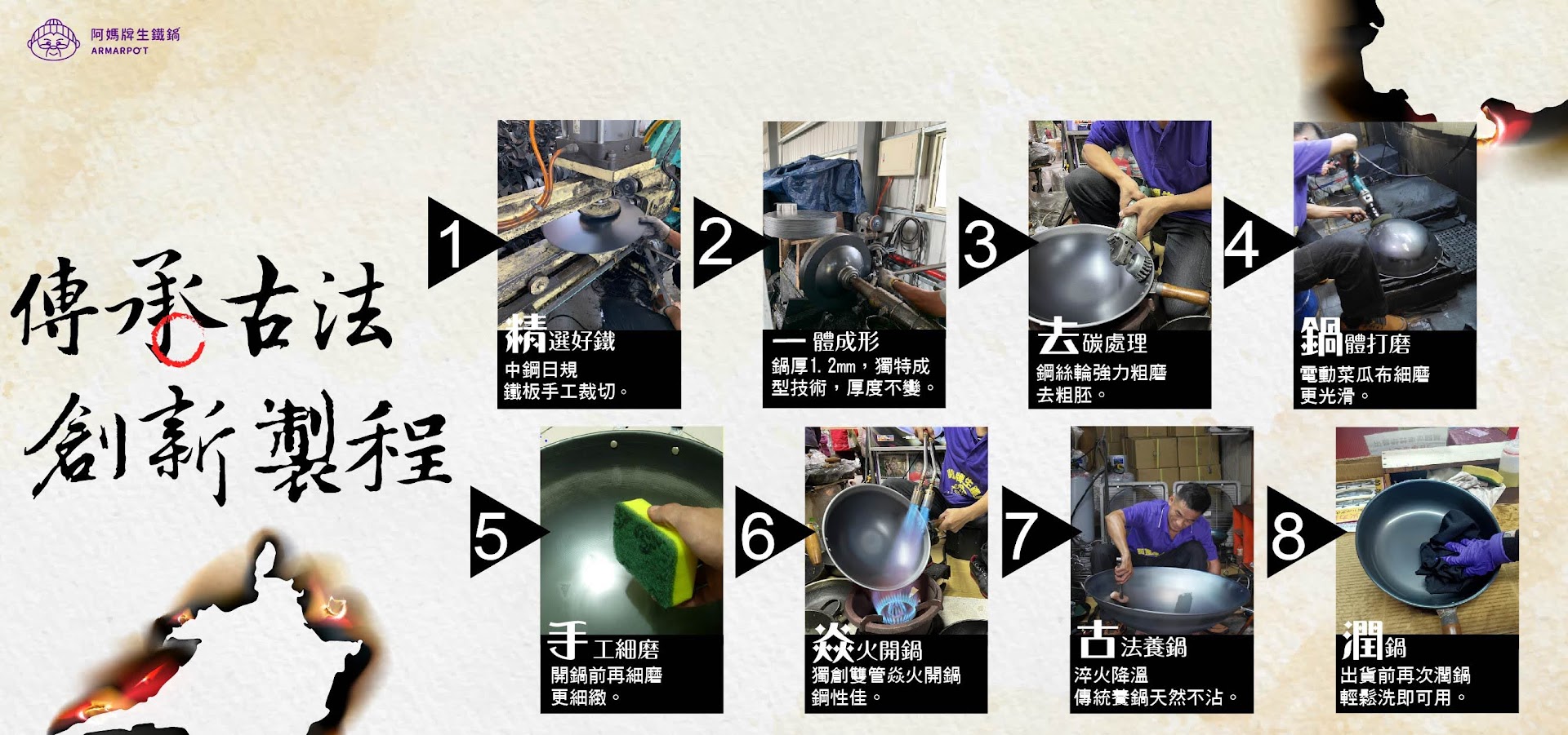 而阿媽牌生鐵鍋採用熱軋鋼捲中最精華的部分,將裁切後的鋼板用手工抽拉的方式製鍋,使其一體成形且厚度不減。除了耐刮、耐磨、耐空燒之外,導熱效果更突出,料理輕鬆產生鍋氣香。