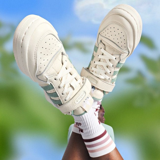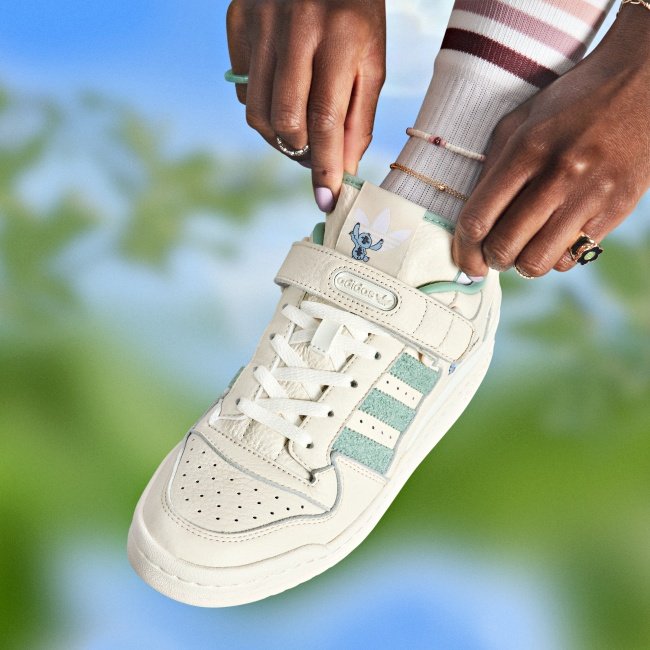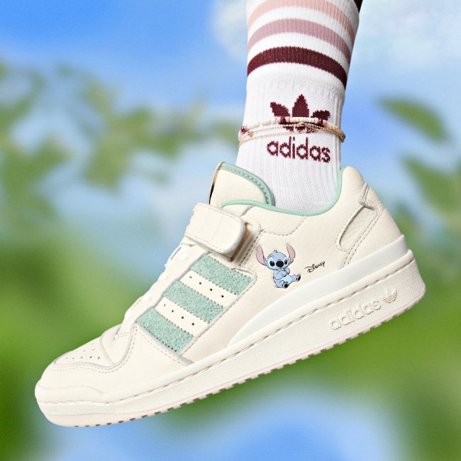 另一雙則是把FORUM復古神鞋變得超萌!帶著淡淡的燕麥米的中筒鞋身,加上魔鬼氈橫扣鞋帶、腳踝十字交叉保護設計,乍看帥度爆表,其實史迪奇已經在上面跟大家打招呼(笑),同時加入溫柔「湖水綠」細節配色,女孩們也能輕鬆駕馭。