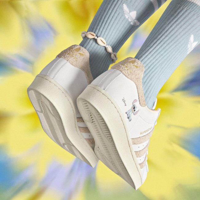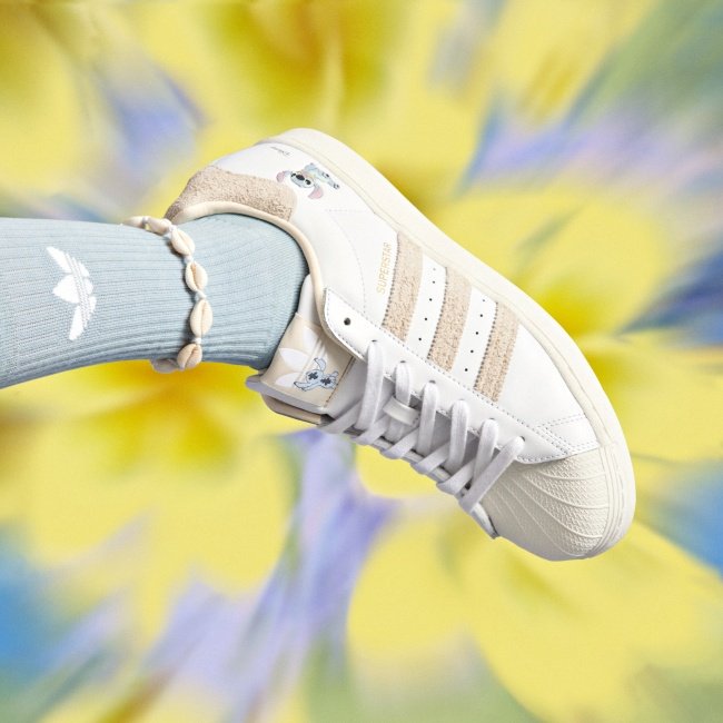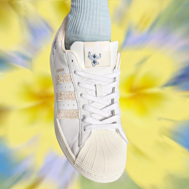 圓圓的貝殼頭、鞋側三條線…經典鞋款「SUPERSTAR」果然是史迪奇首波佔領的據點(笑)!以百搭奶油白為主色系,在細節搭配充滿夏威夷海灘氛圍的「沙灘米」,史迪奇則是整隻神還原鞋後、鞋舌,穿鞋瞬間都會被萌到。