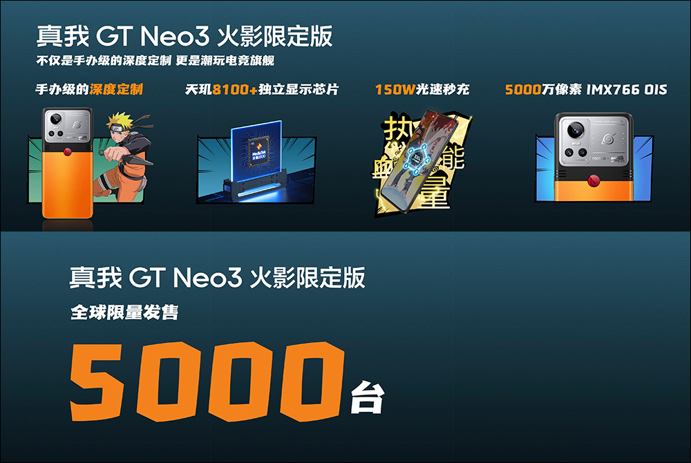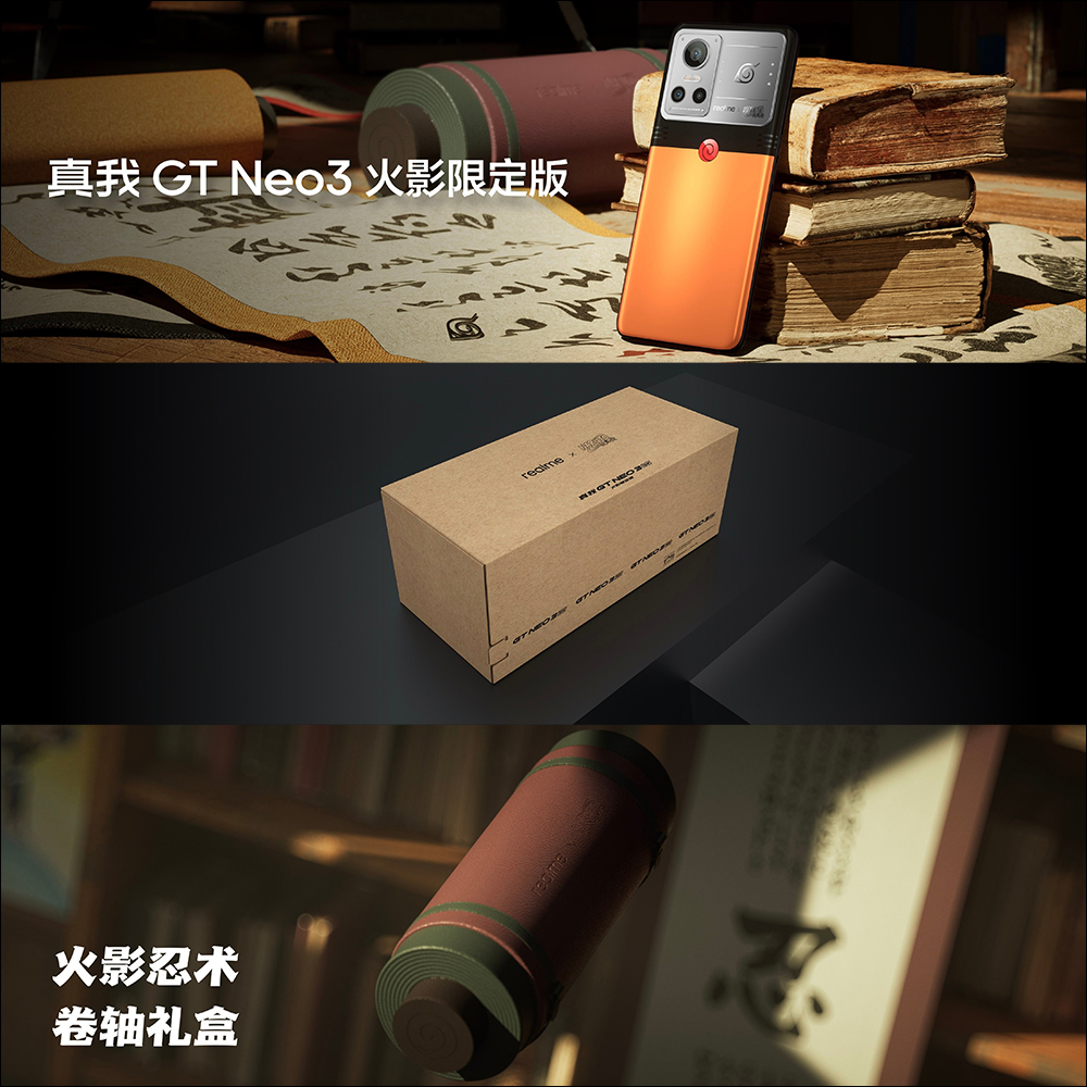 今年初的 realme GT 2 於中國發表時,當時也推出以《七龍珠》為 IP 的 realme GT Neo2 龍珠限定版,隨著前段時間於中國發表全球首款量產 150W 快充的 realme GT Neo3 後,也在今(26)日下午的新品發表會正式發表全新的聯名合作限定款— realme GT Neo3 火影限定版。 realme GT Neo3 火影限定版油 realme 與動漫《火影忍者疾風傳》展開聯名,從機身外觀的設計,到包裝設計、配件以及主題、桌布、應用程式圖示甚至快充的動畫,都花了許多心思設計。