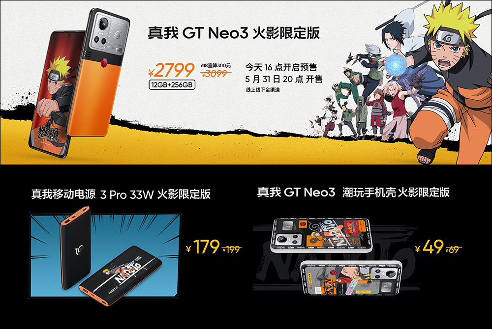 除了手機本身, realme 也為 realme GT Neo3 火影限定版打造三款潮流手機殼和行動電源。