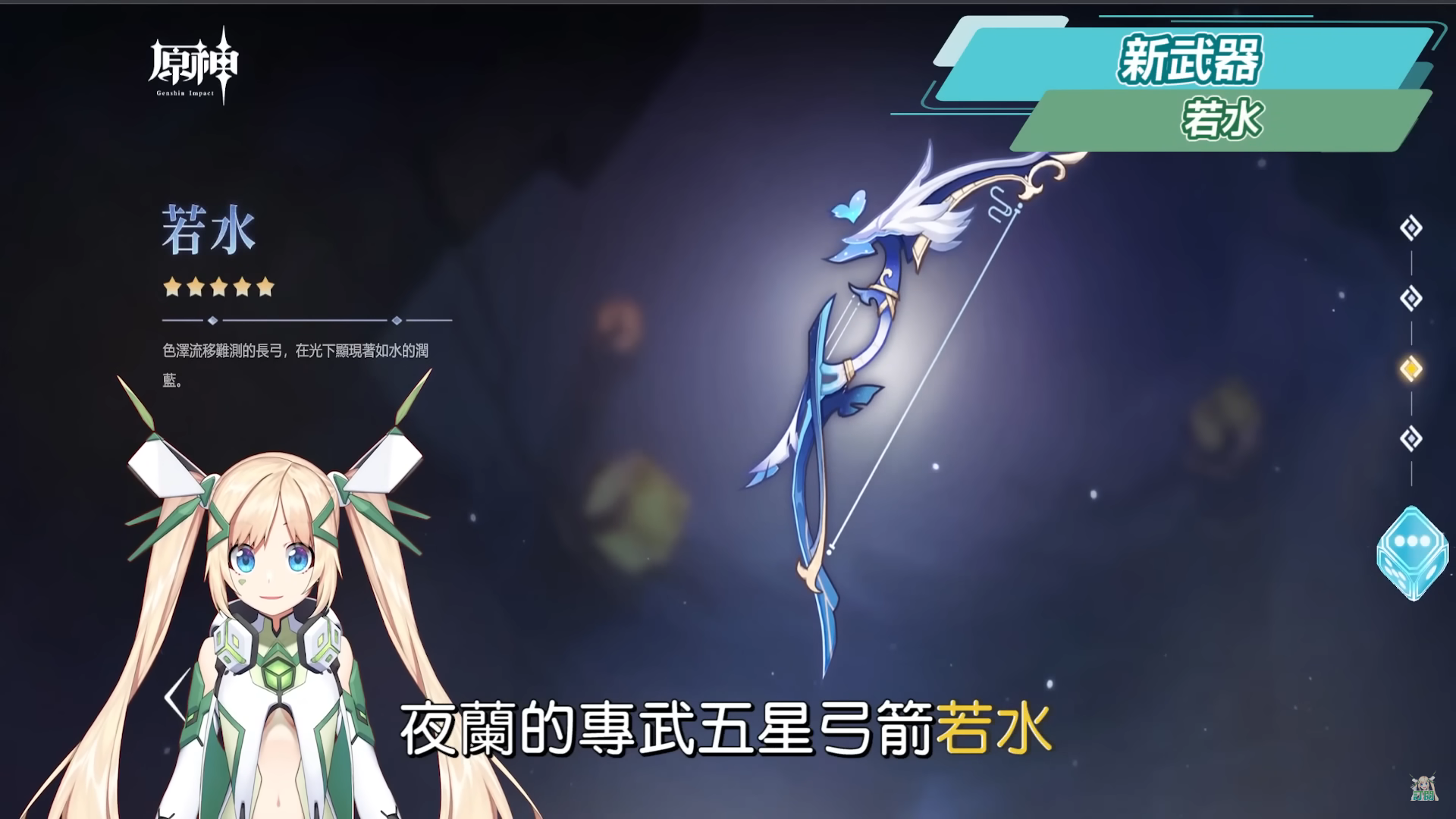 這次2.7版本隨著新五星角色夜蘭的登場,也按照慣例加入了看似夜蘭的專武五星弓箭若水,副屬性提供的是暴擊傷害,90等滿級可以提供88.2%的暴傷,被動效果也是提供夜蘭需要的生命值,同時在周圍存在敵人時,可以使裝備該武器的角色提升造成的傷害,並且不論處於前台或後台都能生效,從整體敘述來看就是很適合夜蘭使用的武器沒錯,此外由於副屬性提供暴傷、被動也提供增傷,或許也可以提供給一些需要輸出的弓箭系角色使用,相關實測心得等後續更新洛洛再跟大家分享。