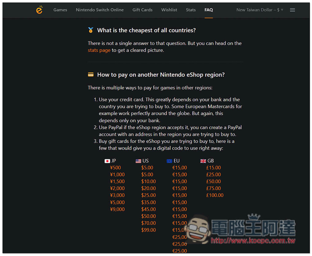 FAQ 頁面中還有不少常見的問與答,像是最便宜的國家是哪一個?要如何在其他國家的 Nintendo eShop 付款?有需要的人也能看一下: