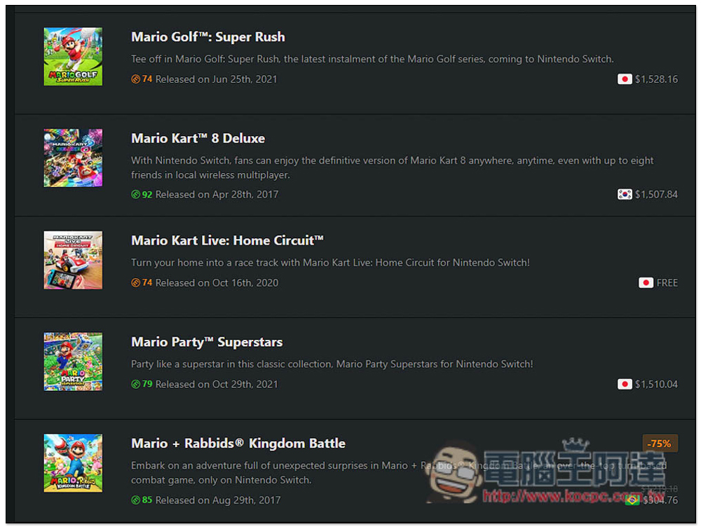 Nintendo Switch 遊戲在每個國家的售價都不太一樣,某些國家有時候還會進行一些促銷,而 Switch 跨區買遊戲也很簡單,不需要用 VPN,因此對於想省錢的朋友來說,跨其他國家買有促銷版本可以省很多,唯一要注意是版本有沒有提供中文的問題。那要怎麼知道哪些國家賣的 Switch 遊戲最便宜?這個 eShop Prices 網站就能讓你快速查詢,每一款遊戲都會清楚列出目前各國的價格,還有願望單功能(免註冊就能用),方面你未來快速追蹤。