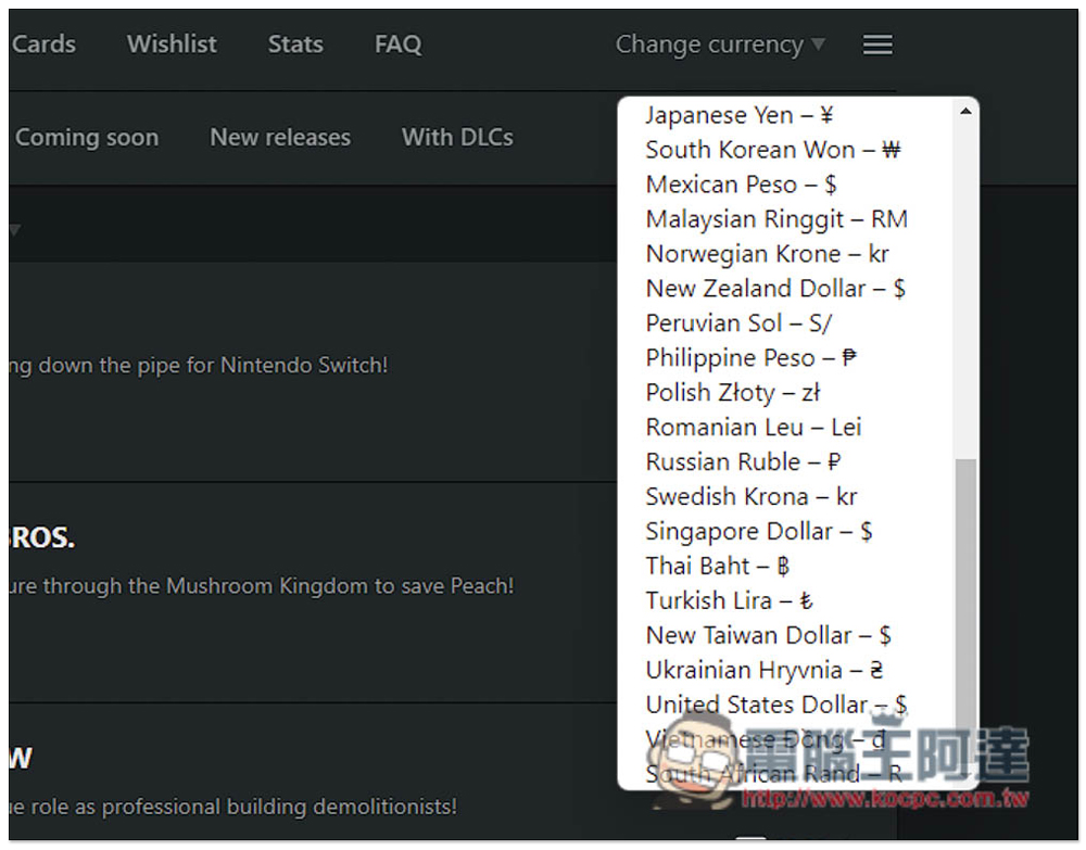 像我搜尋 Mario,就會列出所有 Mario 瑪利歐系列遊戲,記得搜尋英文,中文會找不到結果。最右邊會顯示目前最低價格,預設不是 TWD,點擊上方 Change currency 來改變顯示貨幣: