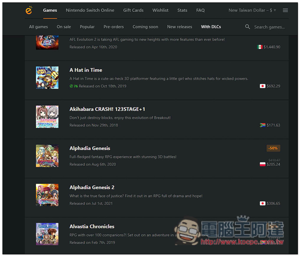 DLC 當然也有,不過這網站收集的 Switch 遊戲數量非常多,建議直接搜尋關鍵字找會比較快: