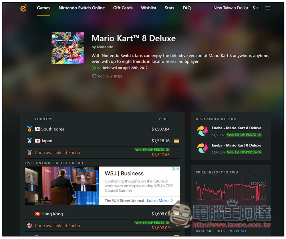 我原本想找 Mario Kart 8 Deluxe 有沒有大特價的國家,結果目前還沒有,依舊要 NT$1,500 以上,直接在台灣買還比較便宜:
