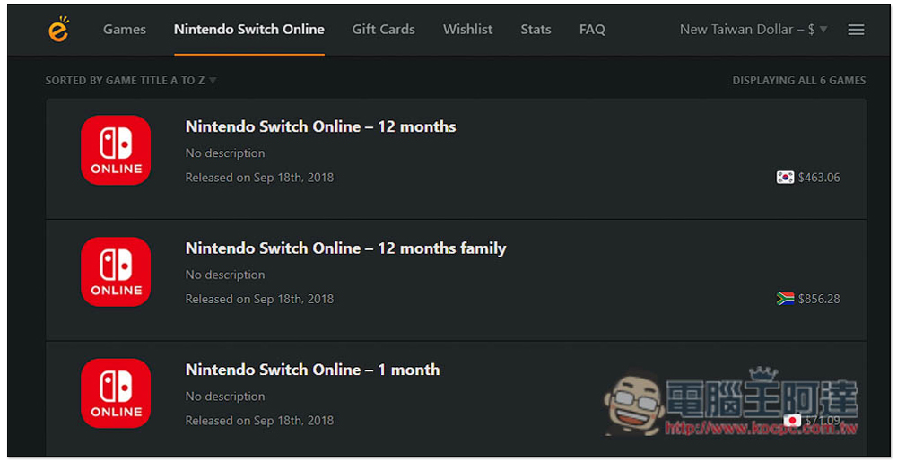 Nintendo Switch Online 會籍,目前 12 個月最便宜是韓國,售價 463 台幣: