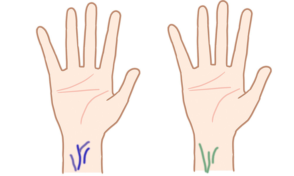 皮膚明暗度很容易分辨,但是想要挑對適合的髮色,就要靠肌膚的冷暖色調作為判斷,而最簡單的辨別方式,就是透過觀察手腕血管握拳凸起時的靜脈顏色,若是較多綠色則為黃底肌;較多藍、紫色則為藍底肌。