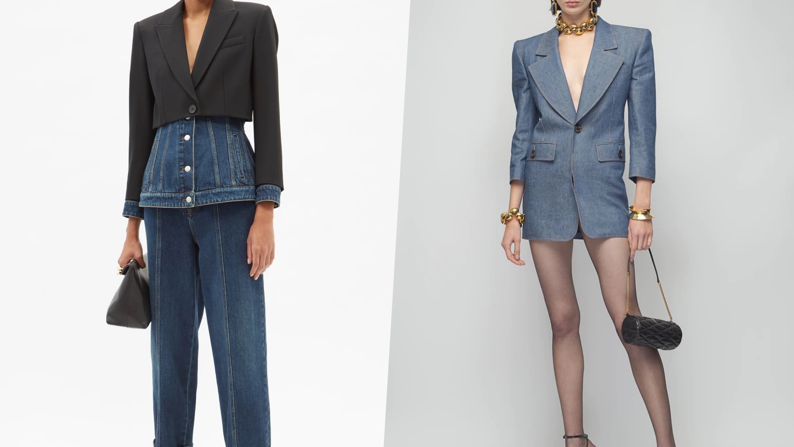 除了整件以牛仔布製成的西裝外套,用西裝布與牛仔布拼接而成的牛仔西裝外套也很特別!Alexander McQueen的這件介於夾克與西裝外套之間的牛仔西裝外套,正面看似是上西裝下牛仔,背面卻又好像是一件單純的牛仔夾克,以多層次拼接打造出趣味風格。