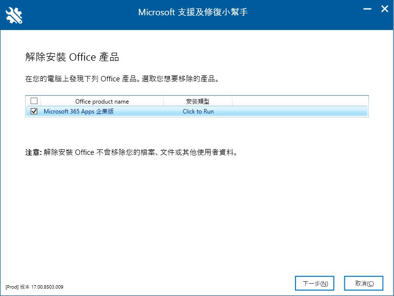 - 經過系統掃描後,視窗中會自動列出你已經安裝的 Office 產品,選擇要刪除的項目後按下一步。