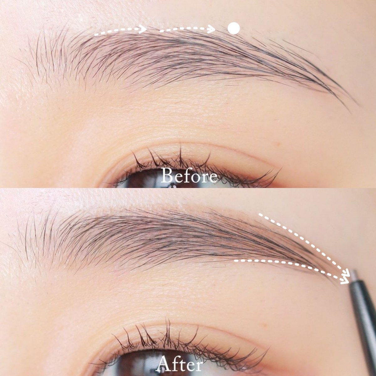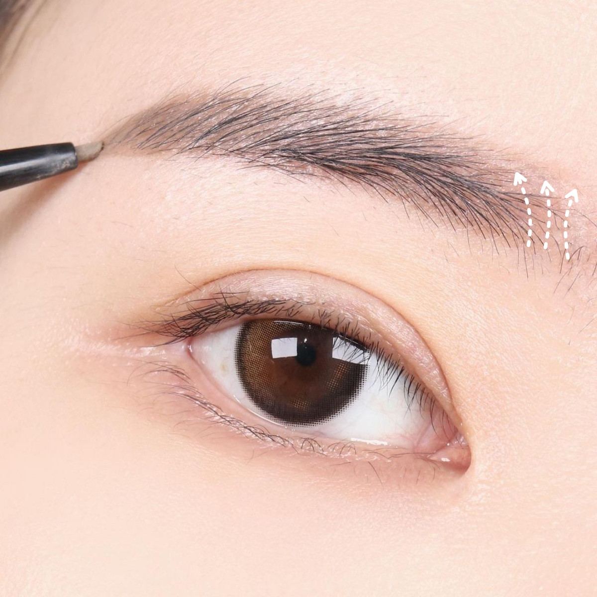 將眉筆轉的方向,以銳利面畫出眉毛下緣,從眉毛中段輕輕往眉頭方向畫出眉毛下緣,注意眉毛下緣不要畫的太死直、而是順著眉型盡可能畫出直線,讓眉毛下緣更自然。