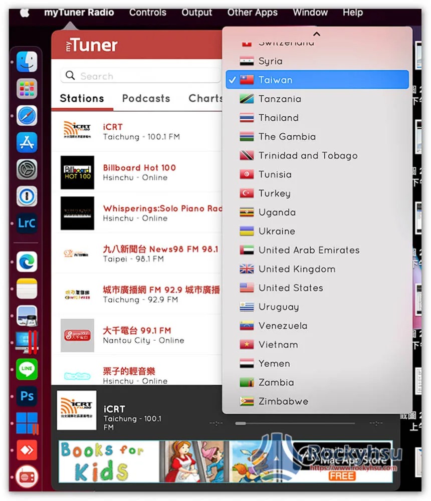 如果你想要聽其他國家的電台,就點擊右上角 Taiwan 字樣,即可改國家: