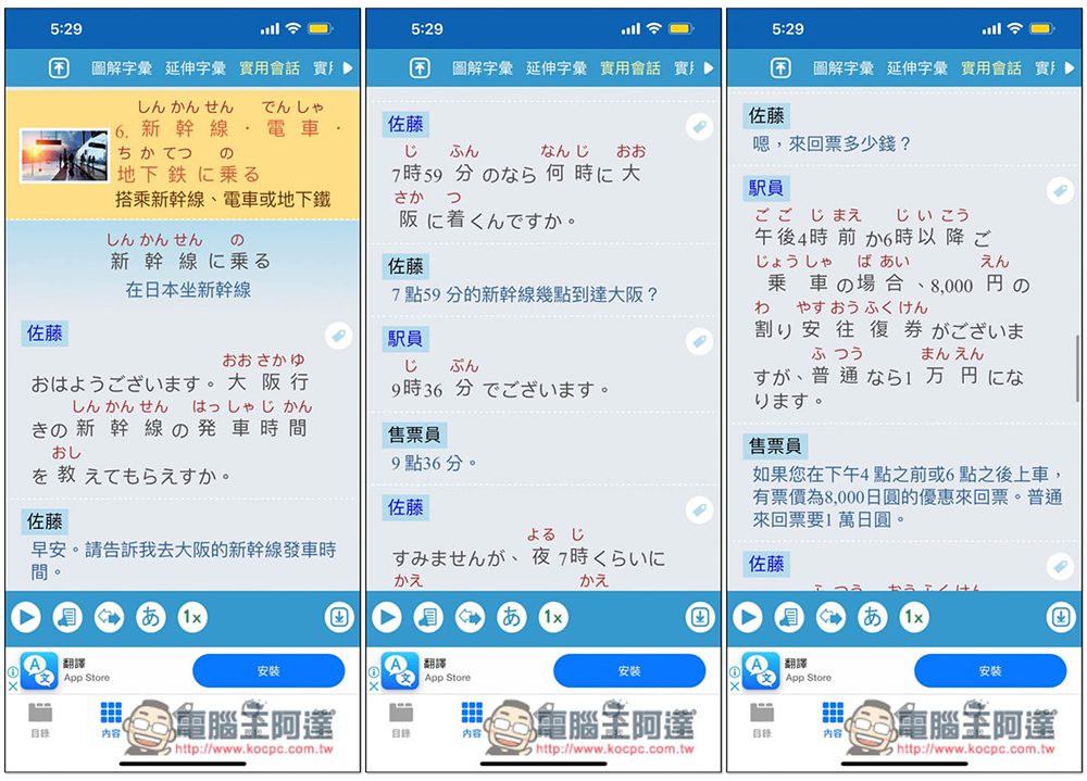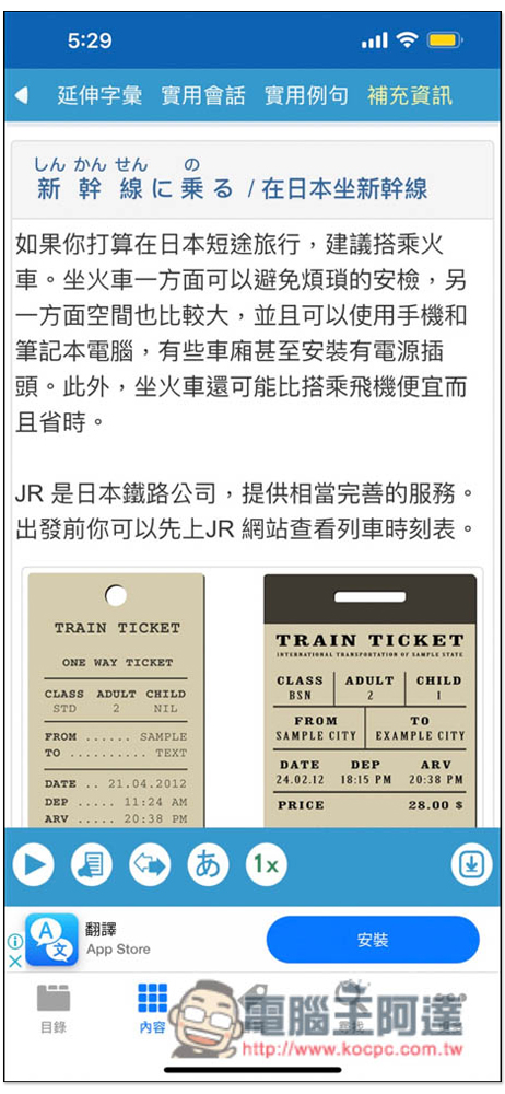 再來是實用會話,會給於一個符合這個主題的情境對話,像新幹線、電車就是問有沒有車可以到哪裡、幾點、以及多少錢: