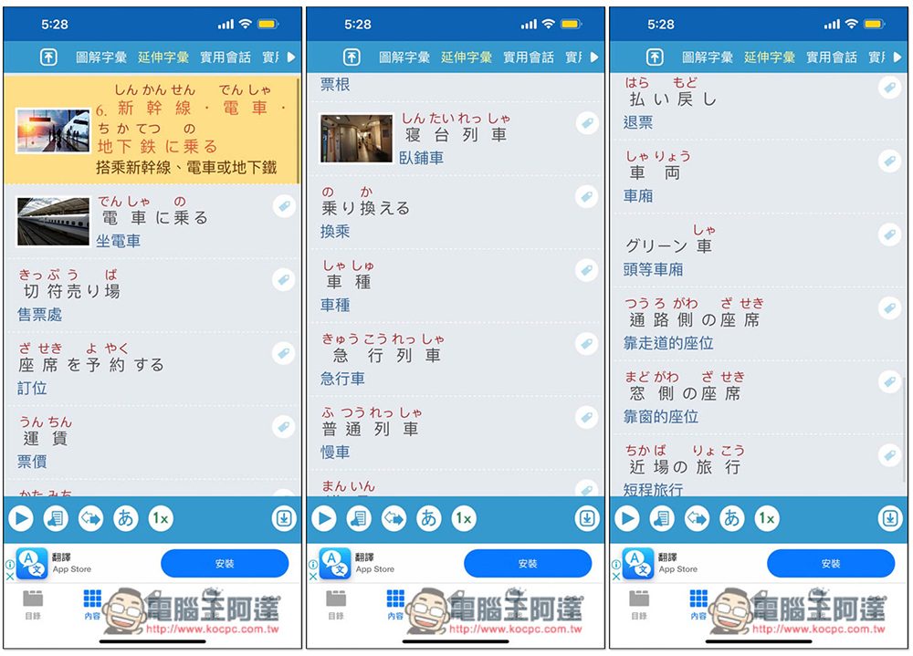 除了常用單字,還提供這主題的延伸單字,像是售票處、定位、票價、車種、及行車、靠走道的座位、靠窗的座位、頭等車廂等等,絕對夠你學: