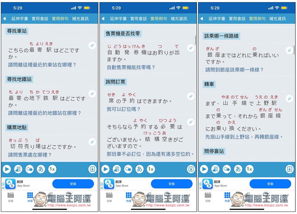 還有實用例句,這我覺得蠻不錯的,比會話更實用。有了這 App,你就知道怎麼詢問「最近的車站在哪」、「到銀座(或其他地方)該乘坐哪一條」、「是否可以訂位」。未來去日本旅遊時,突然忘記怎麼講,也可以直接打開這 App 給對方看: