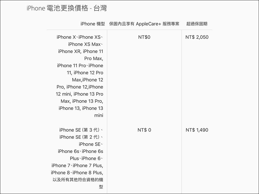 本次燦坤 3C 2的 iPhone 電池更換優惠活動目前已經開始,活動目前預計持續到 2022 年 7 月 10 日止。凡於上述活動期間,持指定機型 iPhone ,前往燦坤《蘋果授權維修中心或全台門市》更換電池,即可享最低限時 NT$990 優惠價!包括 iPhone SE(第 2 代)、iPhone 7、iPhone 7 Plus、iPhone 8、iPhone 8 Plus ,都可享 NT$990 限時優惠價(原價 NT$1,490);iPhone X、iPhone XR、iPhone XS、iPhone XS Max、iPhone 11、iPhone 11 Pro 以及 iPhone 11 Pro Max ,則享有 NT$1,680 限時優惠價(原價 NT$2,050)。以下表格則為 Apple 官網的價格,在沒有使用優惠前更換則昂貴許多。