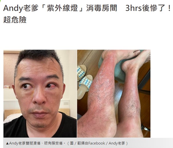 因應新冠病毒爆發,不少民眾會去購買紫外線消毒燈來進行殺菌消毒。根據行政院消保會日前公布抽查市售紫外線殺菌燈檢驗結果,雖然全數符合國家標準,但全數在光化學UV危害部分都呈現高度危害,若使用不當,容易造成人體傷害。汽車達人~Andy老爹日前在臉書發文,突然曬出一組雙腿燙傷、眼角膜也受傷的照片,透露兇手竟然是家中的「紫外線殺菌燈」,因為沒想過威力如此強大,所以才會PO出傷照勸世,提醒大家千萬要小心。