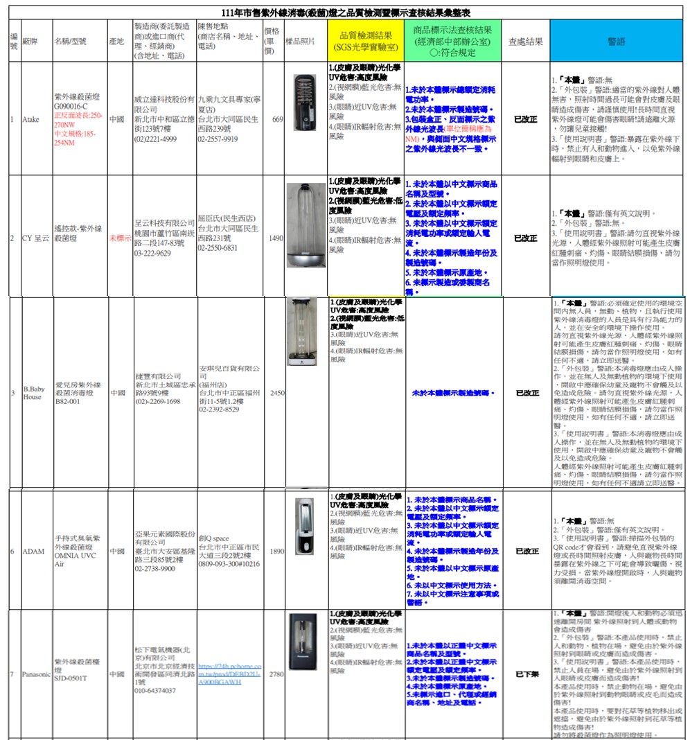 1.行政院消保處抽查紫外線殺菌燈結果: