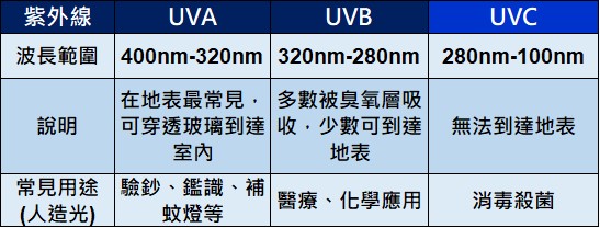紫外線(UV)是指波長介於10nm-400nm的電磁波,由於已超出可見光範圍,無法以肉眼觀測。自然界中的紫外線來自太陽光,在太陽光波長範圍內的紫外線又可以大略分為三種,分別為UVA、UVB、UVC。其中,波長在280nm以下的UVC能夠破壞細菌、病毒等病原體中遺傳物質(DNA/RNA)的化學鍵,讓病原體因為無法正常製造蛋白質,而立即死亡或喪失繁殖能力,達到消毒效果。