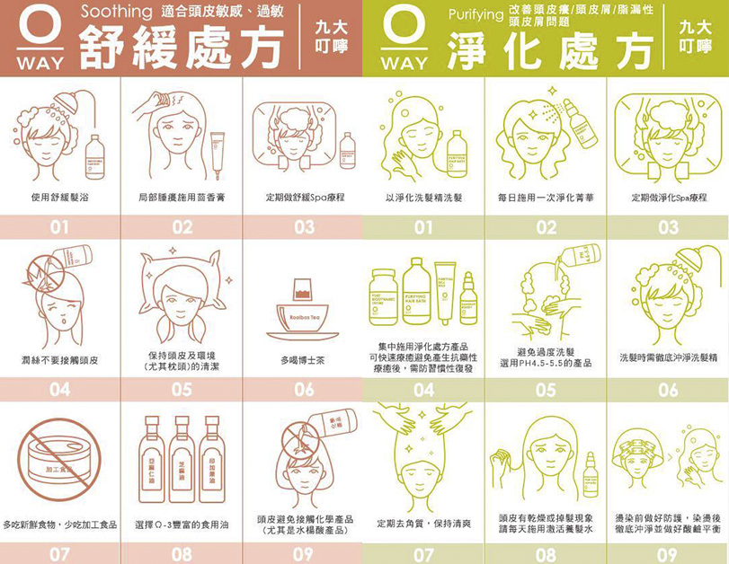 由於COM Hair旗下設計師都是在精實日系美髮訓練下薰陶至少10年以上的資深老手,因此除了鑽研染燙剪等造型技術外,也會特別花心思去協助客戶解決特殊頭皮問題。例如以往總被歸類成同一個問題的敏感/皮屑問題,在這裡卻有截然不同的9大調理建議,像是前者就建議日常居家護髮時要避免髮品碰到頭皮;後者則是要避免過度清潔、選用PH4.5~5.5的中性洗髮精...等。