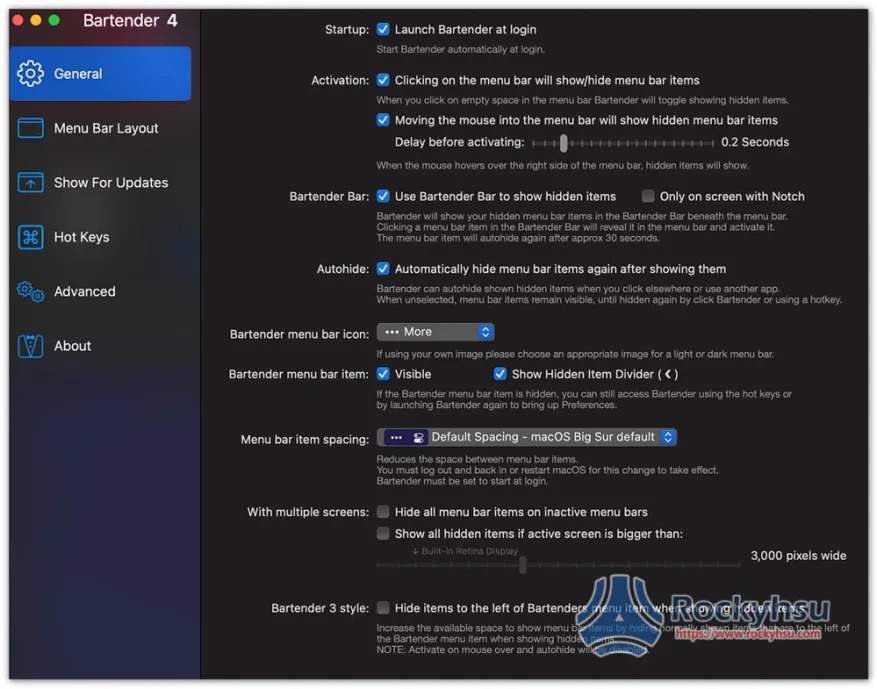 除了選單列佈局,設定中還有很多功能可以依你的需求、喜好來調整,General 裡面就不少,包括是否開機自動啟動、選單列、App 功能圖示的間距等等: