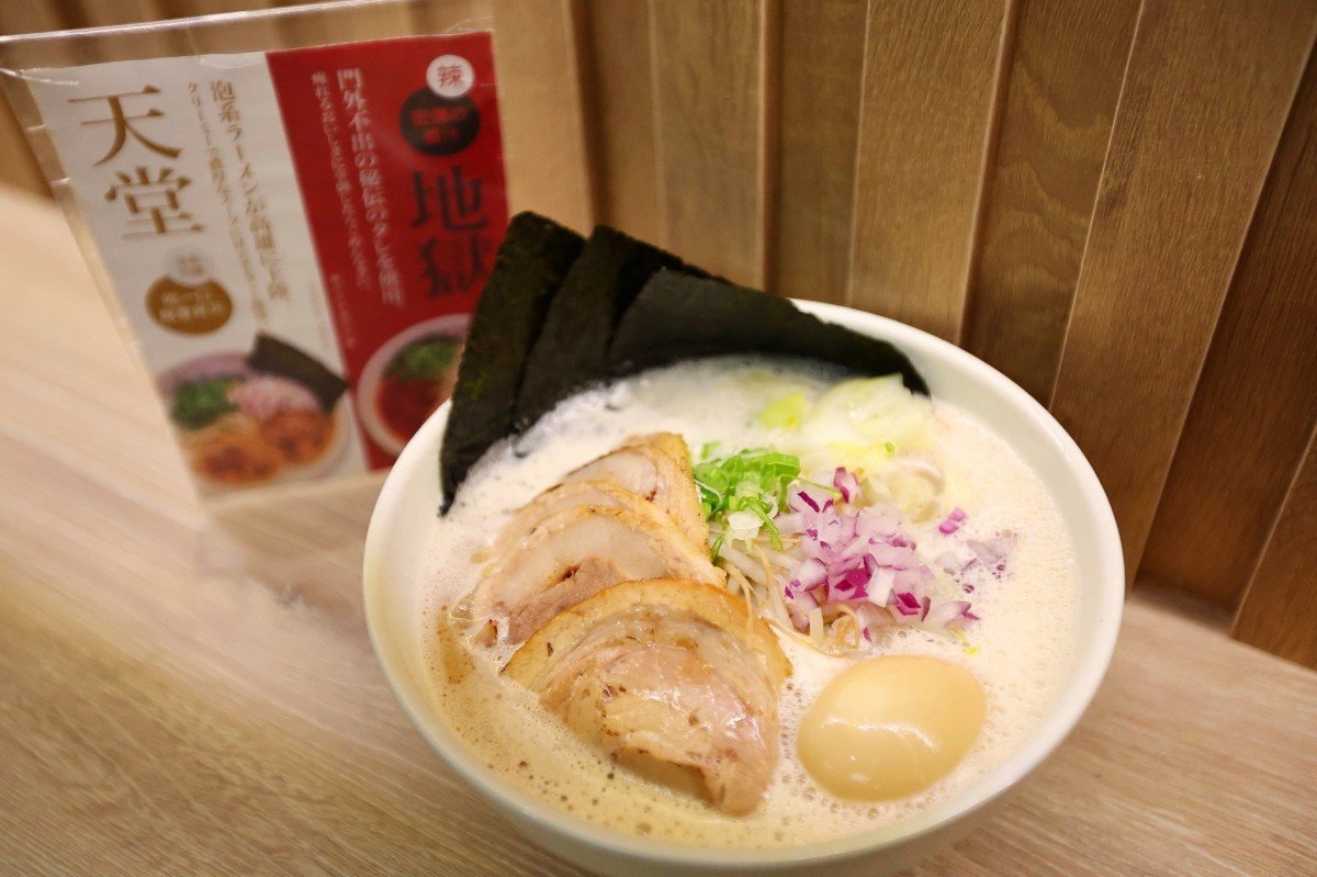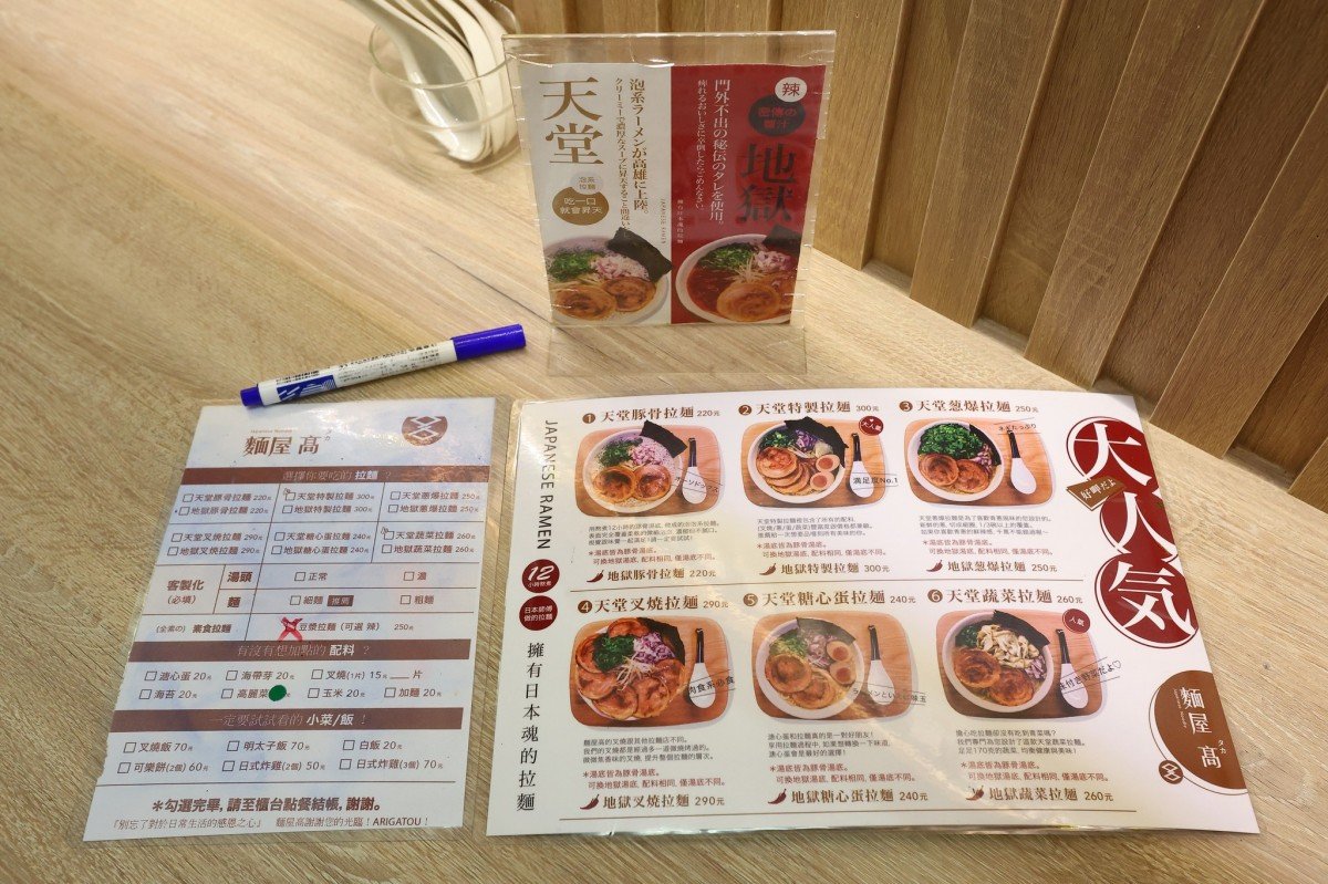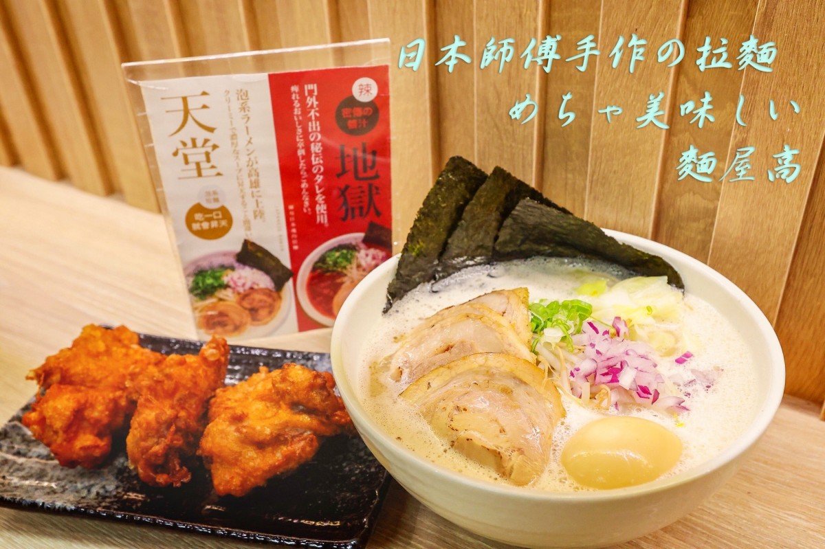 麵屋高一共有兩種不同的湯頭,分為天堂的「泡系豚骨湯」與地獄「辣味湯」,配菜、粗細麵體等都可以自行選擇,一共有蔥、叉燒、蔬菜、糖心六款配菜,還有海帶芽、可樂餅、日式炸雞等小菜,想怎麼吃都可以自己選擇~吃過的麵友更是推薦大家可以將叉燒肉泡在湯碗幾分鐘,吸附湯汁再吃更有味道。