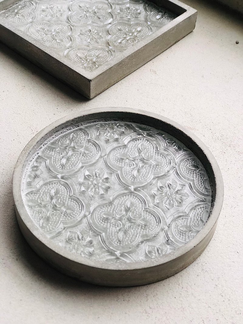 這款海棠花水泥玻璃盤的設計簡單大方,灰色低調的水泥外框,配上經典的海棠花壓花玻璃,完美融合了復古風與時尚感。而且有很多用途,可以擺在桌上當作杯墊,也可以用來擺放蠟燭、擴香石或小盆栽。