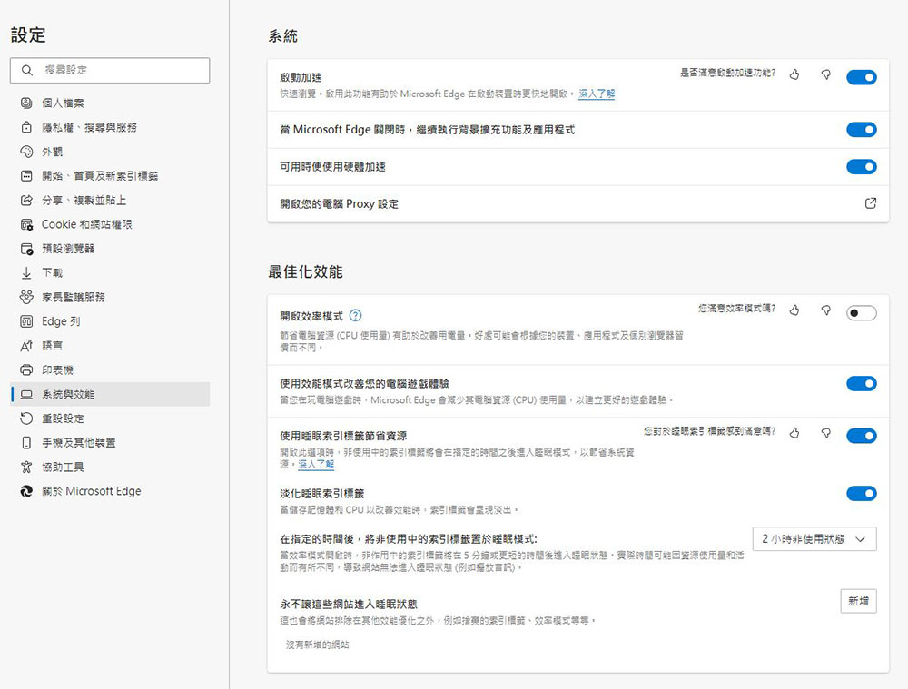 在效率模式下也有一個新功能,而這個功能已經存在。該功能可允許你在可能的情況下將 Edge 設定為使用更少的系統資源,當你玩遊戲時,降低資源占用,使之對電腦效能的影響降到最低,而且你無須退出瀏覽器即可享受遊戲時光。