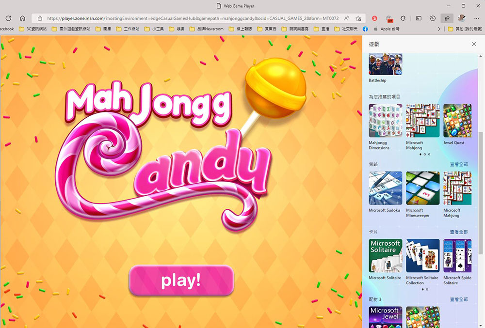 對於休閒類玩家,在 Microsoft Edge 瀏覽器裡面還多了一個遊戲功能表,你可以從瀏覽器右上的三點功能表裡點擊「遊戲」呼叫出側邊欄,其中會顯示你可快速訪問的遊戲套件,例如接龍、掃地雷等,當你點擊後,遊戲會在分頁的主要中間區域顯示,同樣無須離開瀏覽器即可把玩。