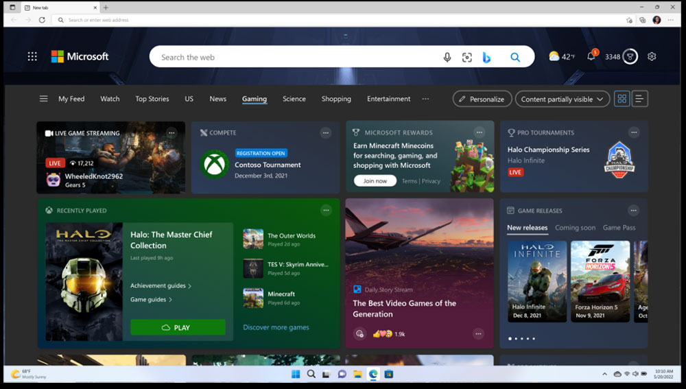 Microsoft Edge 新的遊戲功能是一個嶄新的遊戲主頁,本質上是在瀏覽器新分頁中的部分,當你切換到遊戲主頁時,可以看到最近你玩過ˇ哦遊戲、正在進行的比賽以及當下正在直播的遊戲內容。你還可以從這裡查看最近和即將發表的遊戲,以及一般遊戲新聞和相關資訊。
