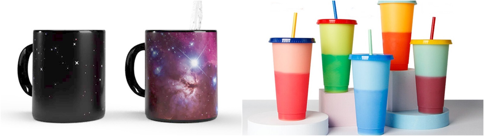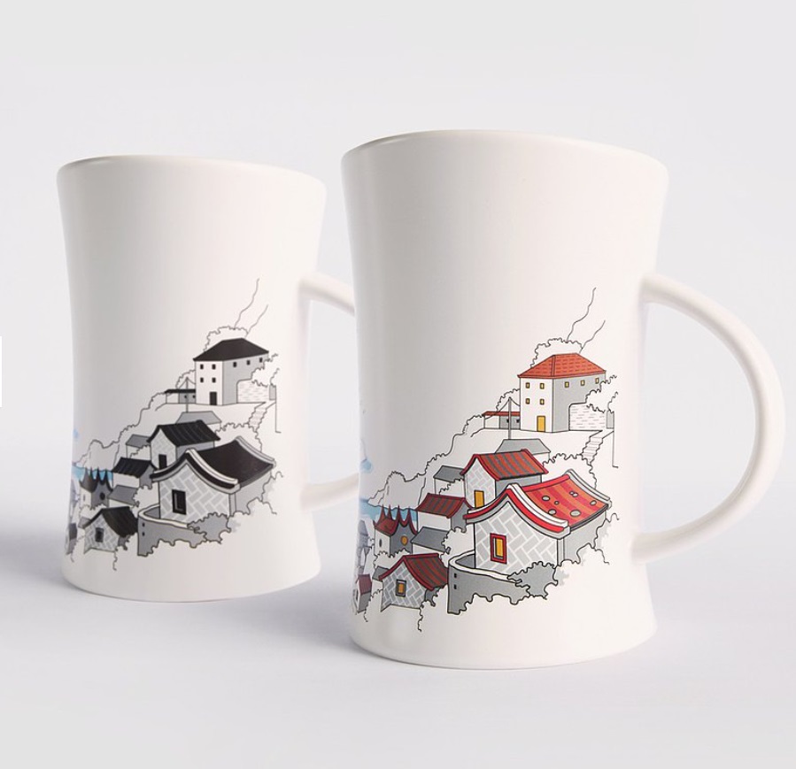 變色杯的變色原理是利用感溫色粉中的油質遇到低溫時會凝固,遇到高溫時會變回液體的特性,產生溫度下降呈色,溫度上升顏色會消失的效果。 通常會將這種變溫材質製成油墨,將圖案印製於陶瓷器、玻璃的表面,讓杯中倒入熱水/冷水後會產生顏色變化。隨著印製方式的不同,也有各式各樣的變色杯可以選擇,來看看以下幾款有趣的變色杯吧!