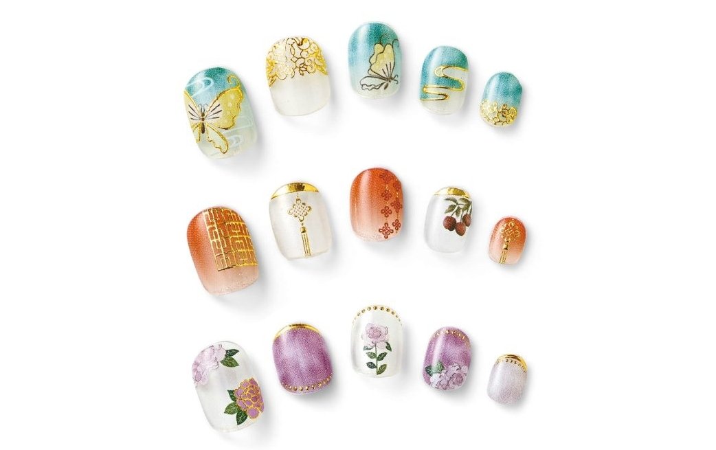 現在有品牌就以楊貴妃為靈感,融入唐代的特色及楊貴妃的喜好像是荔枝、牡丹、翡翠等元素,設計成不同款式的美甲凝膠貼片,不需要辛苦彩繪,只要貼在甲片上就能輕鬆搞定。