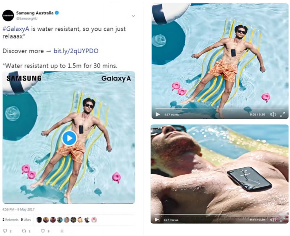 即便有些廣告並沒有將手機放入水中使用,不過也是在泳池等場景出現。 ACCC 主席 Gina Cass-Gottlieb 表示,「許多購買 Galaxy 手機的消費者在決定購買新手機之前可能接觸過誤導性廣告。我們審查了數百起來自消費者的投訴,他們的 Galaxy 手機在暴露在水中後遇到了問題。三星澳大利亞推廣其 Galaxy 手機的廣告以民眾在游泳池和海水中使用手機為特色,儘管這最終可能導致手機受到重大損壞。」