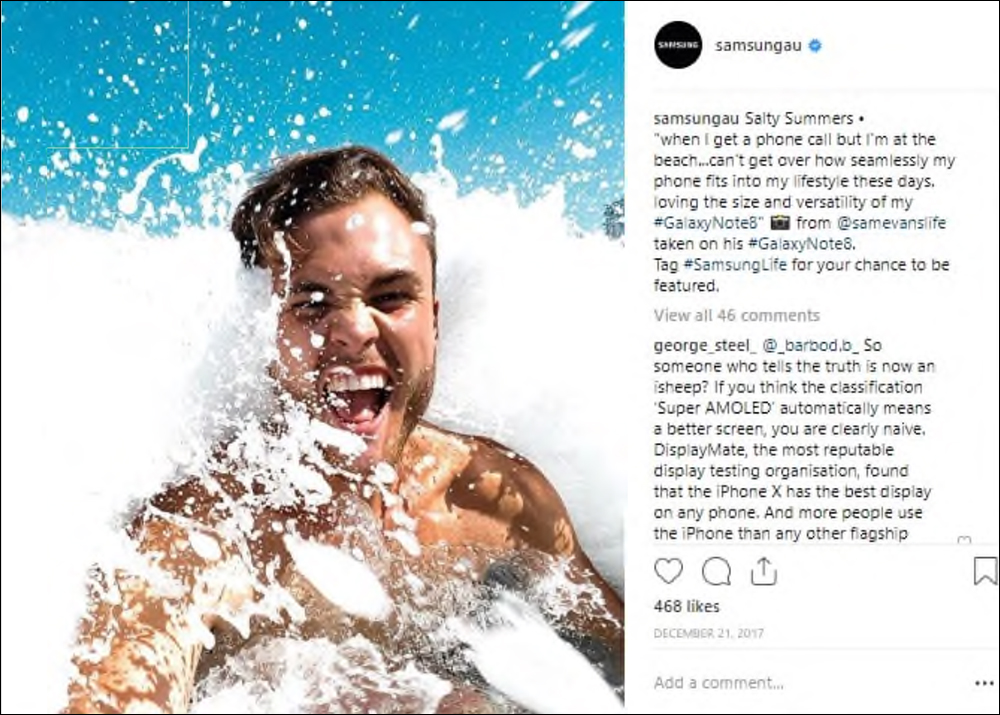 根據 ACCC 聲明,這些年澳洲售出超過 310 萬部 Galaxy 手機。自從 2016 年 3 月至 2018 年 10 月期間,三星澳大利亞開展了一系列宣傳活動,其中包括 9 個廣告,在其網站和店內釋出在 Facebook、Twitter、Instagram 等官方社群平台上展示這些 Galaxy 手機適合用於游泳池和海水。