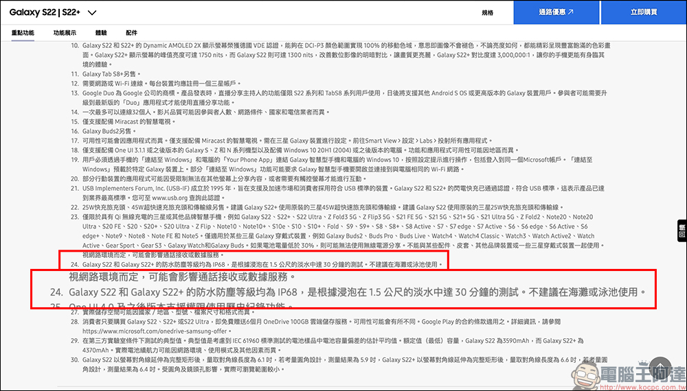 目前最新的 Galaxy S22 系列手機,在官網商品頁面備註其實有提到防水防塵等級均為 IP68 ,並提到「不建議在海灘或泳池使用」。