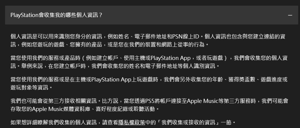 私隱設定部分,PlayStation表示當玩家使用服務或產品時(例如建立帳戶、使用主機或PlayStation App,或者玩遊戲),就會根據使用的服務蒐集相關資訊,如建立帳戶時,會收集玩家姓名和電子郵件地址等個人識別資訊;在主機或PlayStation App上玩遊戲時,會另外收集玩家的年齡、獲得獎盃數、遊戲進度或遊玩對象等資訊;另外透過PS5將帳戶連接至Apple Music等第三方服務時,也可能會存取玩家的Apple Music媒體資料庫、喜好程度紀錄或聆聽活動。
