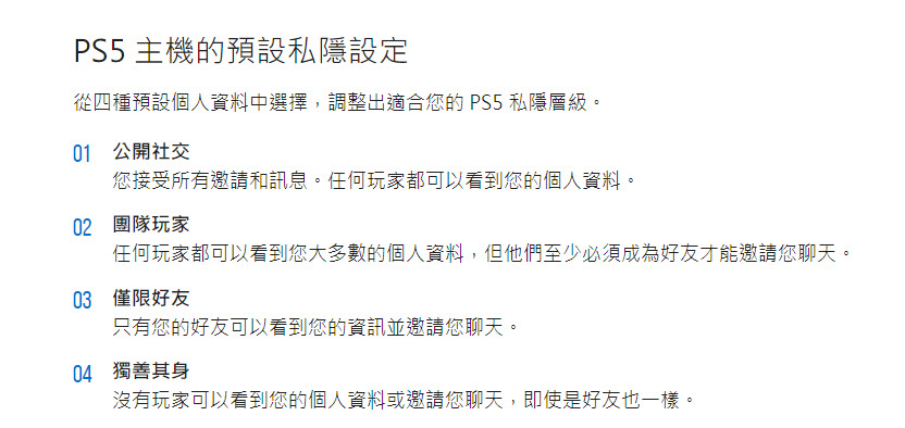 若是想要控制個人資訊的分享設定,如決定誰能查看遊玩的遊戲和獲得的獎盃,就可以透過私隱設定限制 PlayStation Network 上對其他使用者的能見度,而PS5 主機則有4種預設私隱設定,包含公開社交、團隊玩家、僅限好友、與獨善其身。