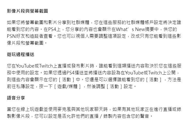 另外還有一些細節可供調整,如針對遊玩過程播送,透過PS4播送並將播送內容設為在YouTube或Twitch上公開的話便會顯示在[活動]中,但可以選擇誰能看到自己的[活動],方法是前往私隱設定,按一下[遊戲/媒體],然後調整[活動]設定。