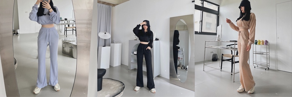 華夫格套裝組合大多都是搭配短褲或五分褲較多,這組搭配微喇叭長褲,再加上短版上衣的設計,穿上之後不管是什麼身型的人比例都會超好。而且褲子的垂墜度很美,整體的延伸效果相當完美,讓妳直接擁有逆天長腿。