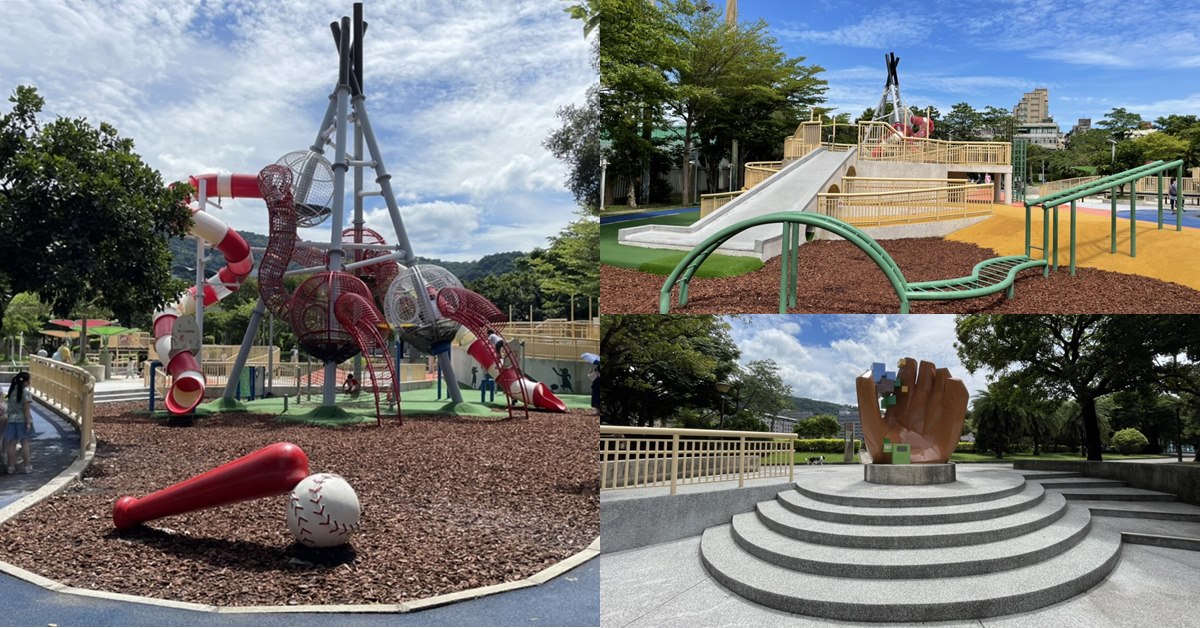 天母運動公園比鄰天母棒球場,接壤台北市立大學天母校區(也就是以前的台北體專),總佔地高達16.8公里,面積非常大,由於在棒球場旁邊,所以公園內的設施、裝飾也都以棒球為主題,想得到的運動設施裡面都有,籃球場、網球場、溜冰場、田徑場一應俱全,孩子最愛的遊樂設施更,尤其是那9公尺高的「棒球元素」蜿蜒溜滑梯,更是讓許多孩子們每次來都要玩上好幾回。