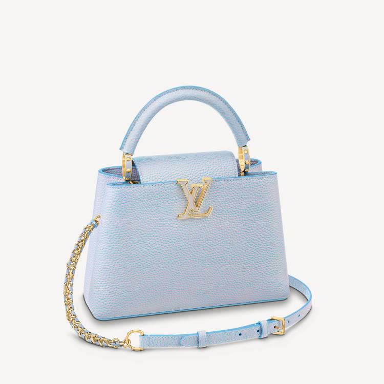 Louis Vuitton 除了經典的老花帆布受到許多女生喜愛,以細緻皮革製作的「Capucines」系列包款亦是許多收藏家的最愛!這次品牌工匠以獨特的染製技巧,讓「Capucines」呈現夢幻色彩,透過不同光影的折熠,可以看見皮革散發出不同的夢幻色彩。(商品售價:NTD226,000)