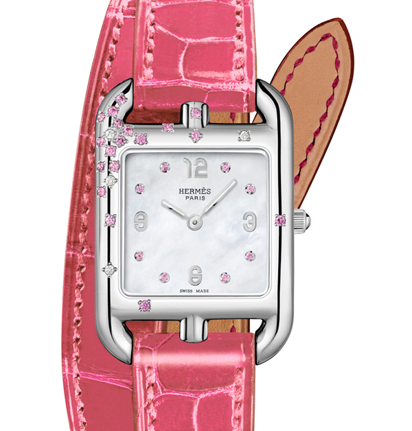 向來走優雅風格的Hermès(愛馬仕)「Cape Cod」腕錶系列,這次在推出特別版的靈感設計,則是藉由粉紅色寶石以及該系列的錶名,並配合上「飄花式」鑲嵌工藝中,巧妙抽象表現出日本春櫻盛開的景緻之美。讓你在這個春末初夏的季節裡,輕盈靈動腕間,盡顯浪漫情懷。