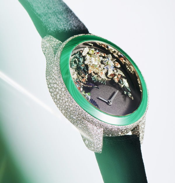 整體靈感取自品牌創辦人Dior(迪奧)先生一生鍾愛的自然花卉,「Dior Grand Jardins De Nuit」限量腕錶,就好比是邀你前往他珍視的私人花園夜遊的邀函。此款面盤上,有著栩栩如生的3D立體效果設計,如:繁茂開展的金質樹枝、葉子,或是以聖甲蟲鞘翅所製成的珍稀花朵…有深、有淺,每一只腕錶上的圖騰皆不同,在在引領配戴者踏入迪奧先生芬芳繁盛的花園中心,很是浪漫。