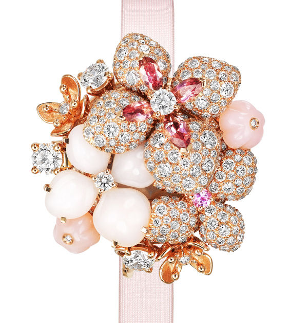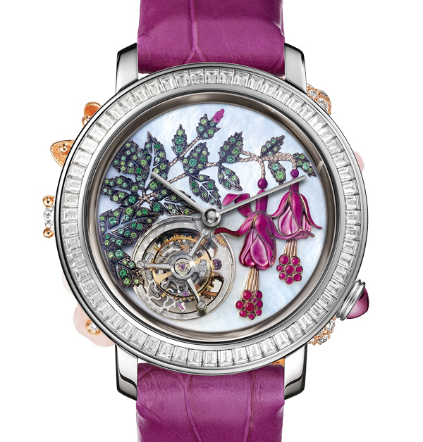 Boucheron(寶詩龍)「Epure」系列之下的「Art」腕錶創作理念,旨在延續文藝復興時期的佛羅倫斯工坊精神,讓在每只時計有限的的微型空間中,展現精妙、絕倫的金銀細工鑲嵌工藝。此款面盤上的粉色琺琅吊鐘花浮雕,在翠綠色祖母綠花莖的襯托下顯得格外耀眼,使其此款腕錶就猶如一扇迎向色彩繽紛的天堂之窗,在傑出的珠寶與製錶大師巧奪天工的創作中,展現出罕有、豐富的大自然美感!