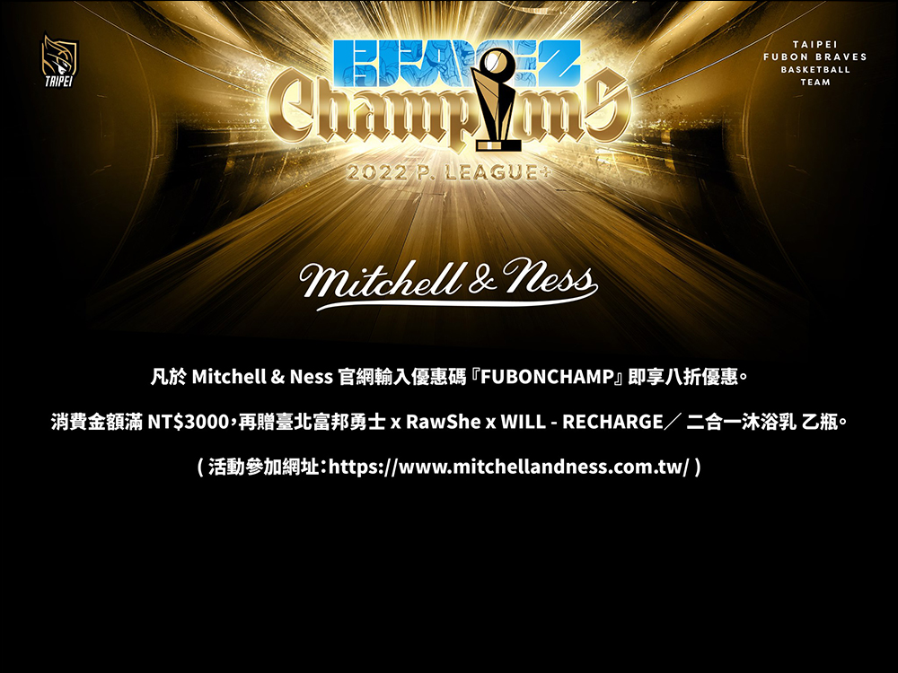 自 6 月 28 日至 7 月 31 日期間,凡於 Mitchell & Ness 官網輸入優惠碼「FUBONCHAMP」即享 8 折優惠。消費金額滿 NT$3000,再贈臺北富邦勇士 x RawShe x WILL - RECHARGE/二合一沐浴乳乙瓶。