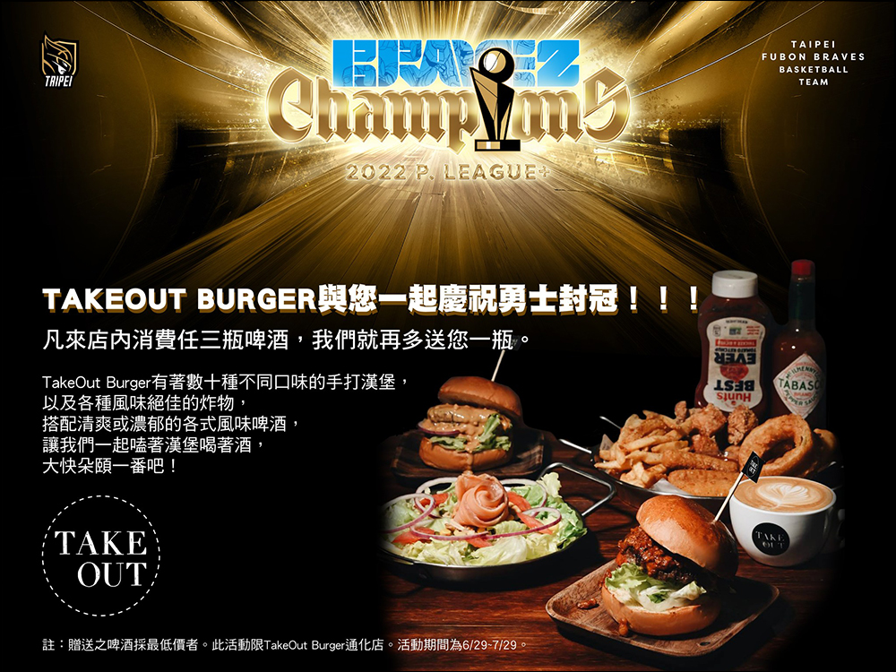 自 6 月 28 日至 7 月 28 日期間攜帶任何富邦勇士 Logo周邊即招待「勇士特調」,限時推出冠軍熱狗堡。