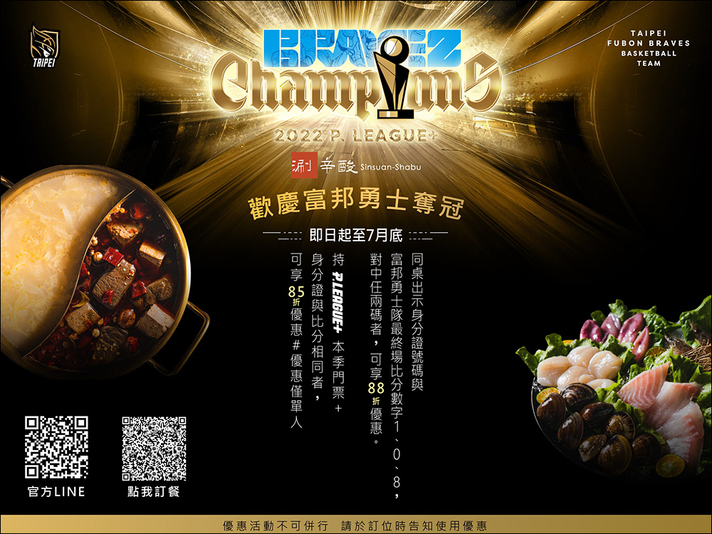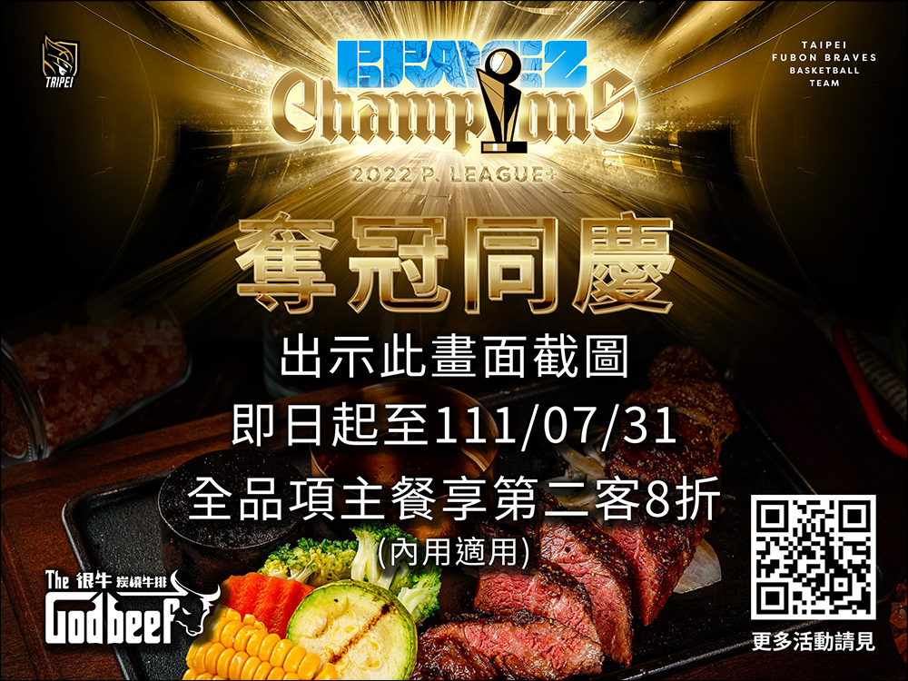 自 6 月 28 日至 7 月 31 日期間到店消費出事富邦勇士活動貼文、新聞稿或任何提及封王慶祝活動的曝光畫面截圖,即享主餐全品項第二客 8 折優惠。