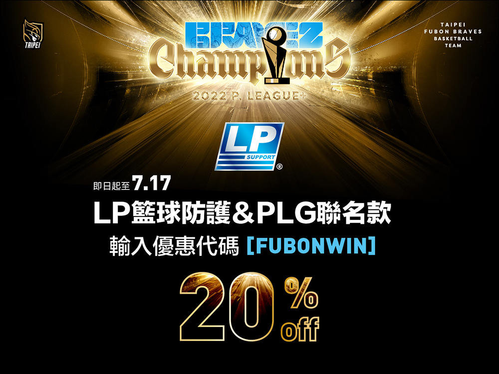 自 6 月 28 日至 7 月 17 日期間, LP 籃球運動防護&P.LEAGUE+ 聯名款,結帳輸入優惠代碼「FUBONWIN」享 8 折優惠。